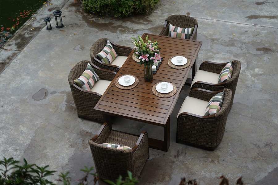 融入欧洲皇室传统手工艺以及新中式的格调,表面颜色经过5道手工制作程序处理,铸铝支架具备了柚木的颜色和手感,桌面仿木色处理,长久使用不会褪色。系列分为全铸铝桌椅,沙发,以及藤艺桌椅,沙发组合。
